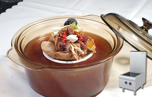 煨湯火候的要訣是大火燒沸(東方和利:電磁低湯灶),小火慢煨。一方面可使食物的鮮香物質(zhì)盡可能地溶解出來,另一方面使湯清不渾濁。