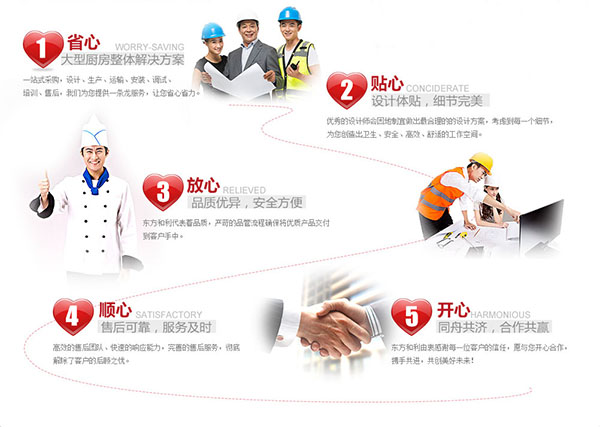 東方和利廚業(yè)首次制定了"五心"服務(wù)體系,即采用"省心、貼心、放心、順心、開心"的"五心"服務(wù)體系全程保障,為客戶提供廚房設(shè)計咨詢、設(shè)備生產(chǎn)、運(yùn)輸、安裝、調(diào)試、培訓(xùn)、售后等全套服務(wù)。