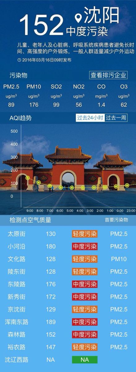 接下來共同關注沈陽未來幾天的具體天氣:今天白天溫度與昨天相似,最高氣溫為15℃,白天風力仍然較大,5-6級西南風。今天雖有陽光相伴,但是空氣質量相對差了一點,為重度污染;夜間風力稍弱,最低氣溫2℃。