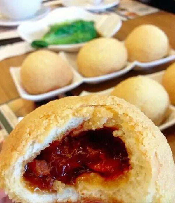 與傳統(tǒng)白嫩的包子做法不同,酥皮焗叉燒包有金黃酥軟的外皮,長得與香港菠蘿包有幾分神似,但里面塞了肉餡,的確又是包子的做法。