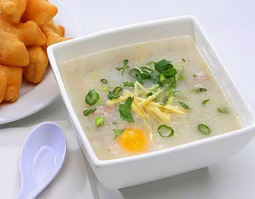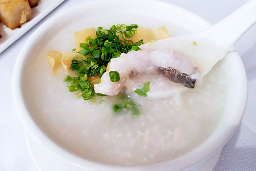 將魚肉切成薄片,和生姜一起放入粥內(nèi)。還可加入醬油、胡椒、蔥和油炸洋蔥等。