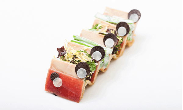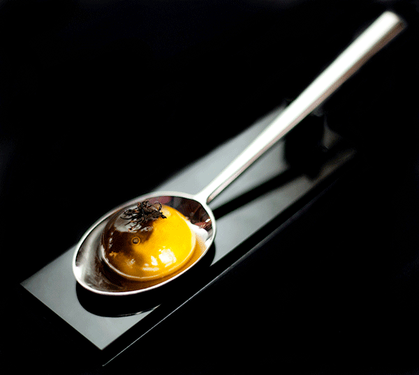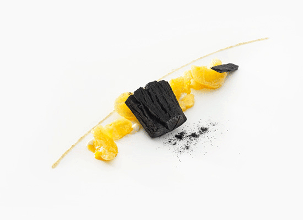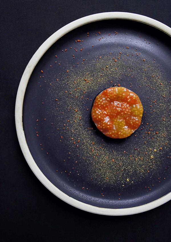 ↑↑↑大西洋小龍蝦卵點綴番茄,又是一個同心圓的擺盤方式,與黑色的盤子特別配。