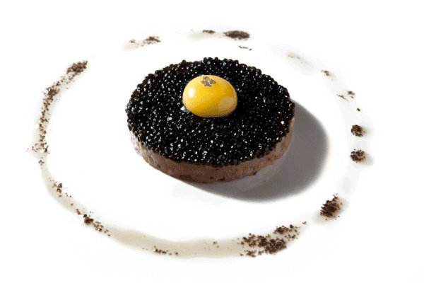 ↑↑↑黃色的蛋芯,黑色的松露,最下層是誘人的韃靼牛肉,對比鮮明的色彩,完美同心圓,強迫癥患者的福音。