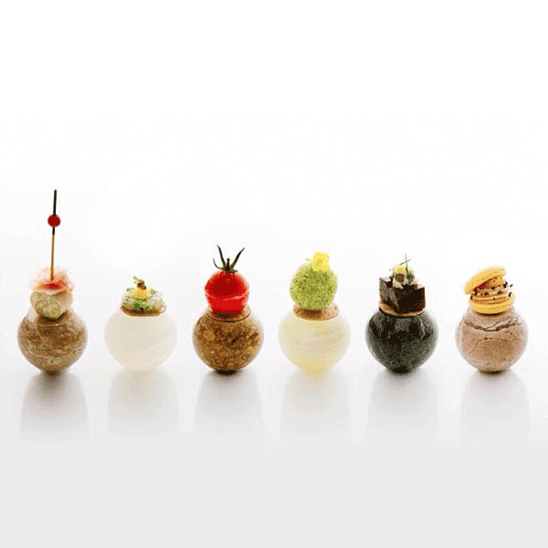 ↑↑↑前菜小品,六種不同菜式端坐在圓球上,小巧可愛,從左到右常溫、冷盤區(qū)分細致,每一口都是不同的體驗。