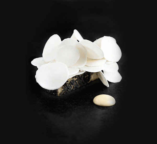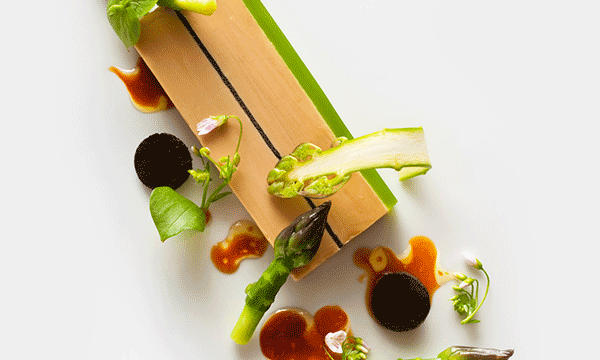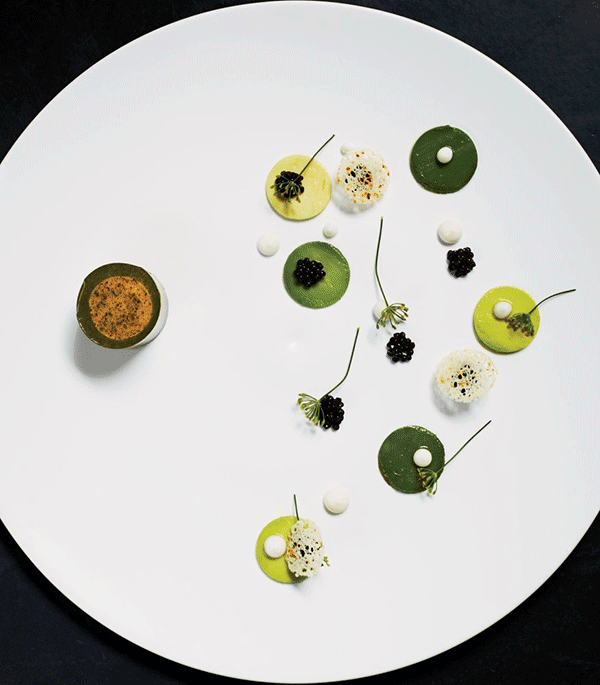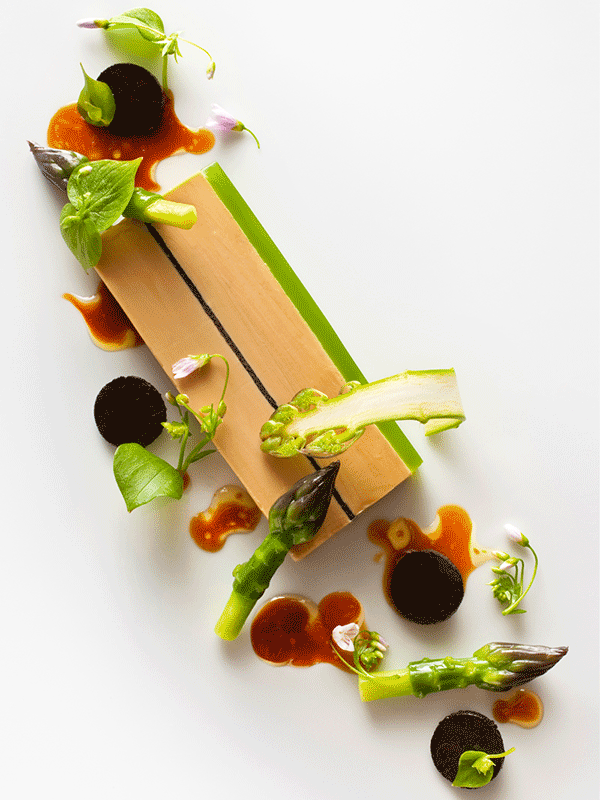 ↑↑↑綠色醬汁打底,點綴紅蘿卜、紫洋薊、碗豆等春季蔬菜的鮮艷色澤,5:5的精致比例,在視覺上完美平衡。最后再撒上黑松露,Bingo上桌!