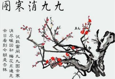 冬至一到,開始數(shù)"九"。在古代,入九以后,文人墨客喜歡搞消寒活動,擇一"九"日,相約九人飲酒("酒"與"九"諧音),席上用九碟九碗,成桌者用"花九件"席,以取九九消寒之意。