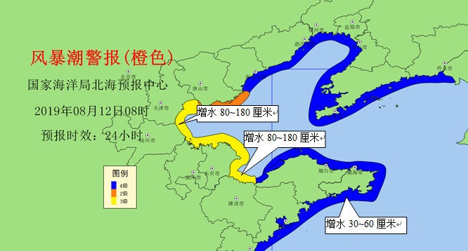 自然資源部北海預(yù)報(bào)中心官方微博發(fā)布風(fēng)暴潮預(yù)警,受今年第9號(hào)臺(tái)風(fēng)"利奇馬"(熱帶風(fēng)暴級(jí)別)影響,預(yù)計(jì)8月12日上午到13日上午,山東半島沿岸將出現(xiàn)30-60cm的風(fēng)暴增水,萊州灣和渤海灣沿岸將出現(xiàn)80-180cm的風(fēng)暴增水。曹妃甸和京唐港驗(yàn)潮站將出現(xiàn)達(dá)到當(dāng)?shù)爻壬涑蔽坏母叱蔽?。濰坊港、黃河海港、濱州港、黃驊和塘沽驗(yàn)潮站將出現(xiàn)達(dá)到當(dāng)?shù)攸S色警戒潮位的高潮位,蓬萊、龍口和秦皇島驗(yàn)潮站將出現(xiàn)達(dá)到當(dāng)?shù)厮{(lán)色警戒潮位的高潮位。河北省唐山市預(yù)警級(jí)別為橙色,山東省濰坊市、東營(yíng)市和濱州市,河北省滄州市和天津市預(yù)警級(jí)別為黃色,山東省日照市、青島市、威海市和煙臺(tái)市,河北秦皇島市預(yù)警級(jí)別為藍(lán)色。