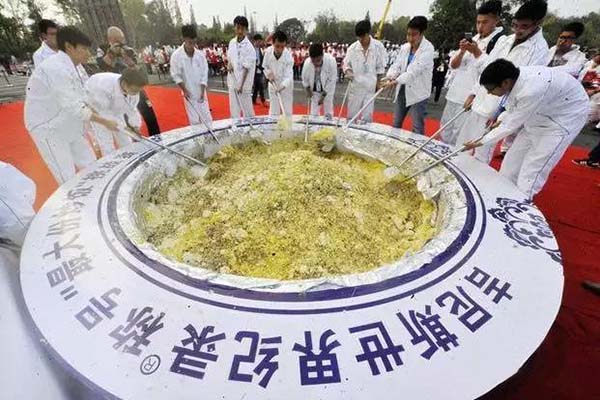 據了解,2015年是揚州建城2500周年,世界中國烹飪聯合會、揚州市旅游局、揚州市烹飪協(xié)會等單位舉辦了創(chuàng)"最大份炒飯"、刷新吉尼斯世界紀錄活動。此前,刷新此項紀錄的是土耳其,2014年9月認證的總重量是3150公斤。