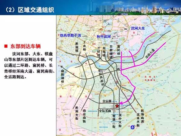 沈河?xùn)|部、大東、棋盤山等東部片區(qū)到達(dá)車輛,可以通過二環(huán)路、富民橋、長青橋經(jīng)渾南大道、富民南街、全運路到達(dá)。