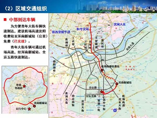 為方便青年大街車輛快速到達(dá),建議機場高速沈陽收費站至渾南新城站(公里)免費(已實現(xiàn))。