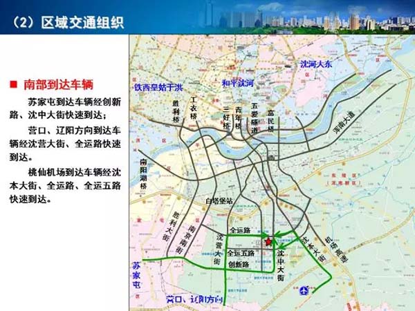 蘇家屯到達(dá)車輛經(jīng)創(chuàng)新路、沈中大街快速到達(dá);營口、遼陽方向到達(dá)車輛經(jīng)沈營大街、全運路快速到達(dá)。桃仙機場到達(dá)車輛經(jīng)沈本大街、全運路、全運五路快速到達(dá)。