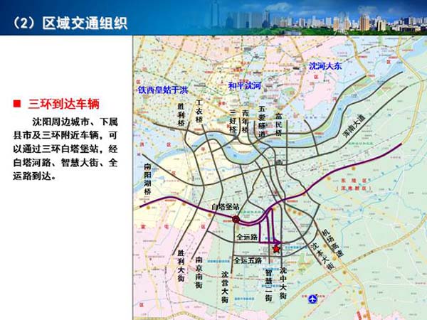 沈陽周邊城市、下屬縣市及三環(huán)附近車輛,可以通過三環(huán)白塔堡站,經(jīng)白塔河路、智慧大街、全運路到達(dá)。