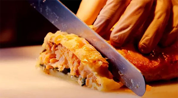 這道烤挪威酥皮三文魚,選取新鮮的挪威三文魚,除去魚骨、魚皮,用海鹽、百里香等秘制調(diào)料腌制2小時以上。松軟的酥皮將其緊緊地包裹,再以黃油和秘制醬汁淋于表面,中火烤制而成??诟猩贤馑掷锬郏肺度聂~鮮美的同時,還混合著黃油的香味。