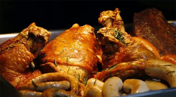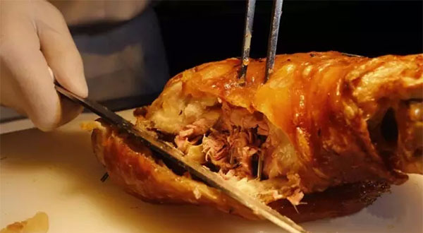德國咸豬肘,選用肉質(zhì)鮮嫩的豬前肘,浸泡于月桂葉、杜松漿果調(diào)制的鹽水中至少24小時。次日,先以大火蒸、再用秘制調(diào)料刷,最后再經(jīng)過180度和220度的兩輪烤制,方可上桌兒。這樣的做法,讓豬皮充分膨脹、入口酥脆,外焦里嫩到了骨子里。