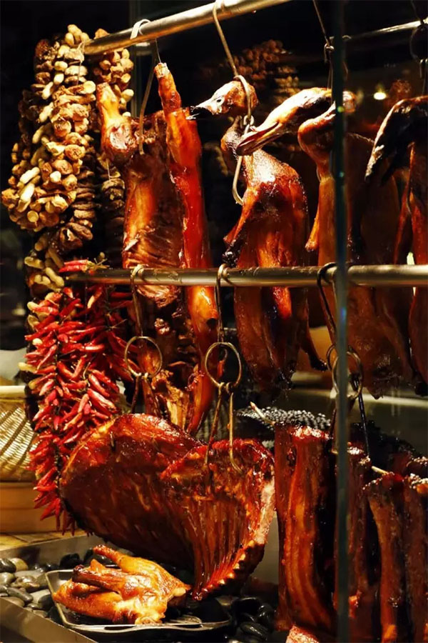 粵式燒臘甘香可口、品種繁多,就連難得一見的明火烤乳豬也現(xiàn)身其中?;浭讲鏌谄渲休^受歡迎。肥瘦相間的豬五花腩以玫瑰露和10余種醬料煨上8小時,醬汁的鮮味噙滿肉身,掛上麥芽糖做的糖色兒,再烤上一陣兒就能出爐啦。