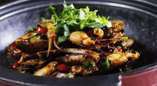辣炒蟶子絕對是下酒菜中的種子選手。以美人椒、杭椒爆香,再以秘制豆豉醬汁調(diào)味,大火翻炒蟶子3分鐘即可起鍋。倒入盤中,蟶子色澤飽滿,蟶子肉上滲著辣汁兒,嗦啰一只滿口鮮。