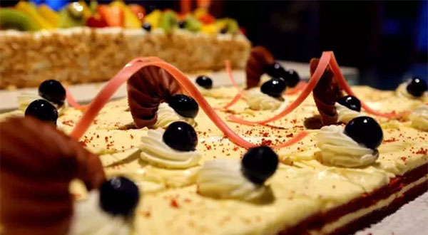 晚餐時,可以自取的甜品多達30多種,均是由糖立方實時供應(yīng)。紅絲絨、芝士蛋糕……香甜絲滑,松軟適中,且不甜膩。食材全部采用國外進口,用料精確到克,品質(zhì)得到了極高的保證。
