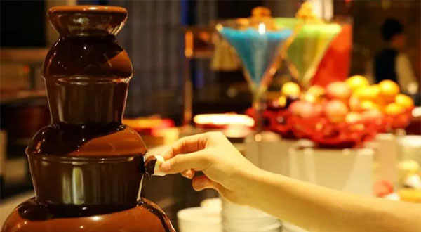 每逢海鮮之夜,都會備上孩子們的味蕾統(tǒng)領(lǐng)——巧克力噴泉。醇厚的德國巧克力柔滑香甜,在棉花糖表面裹上一層,滿是甜蜜的幸福感。
