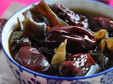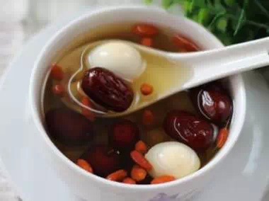 紅棗加桂圓煲紅糖水,到棗爛、桂圓綿時(shí),打只雞蛋;繼續(xù)用小火焐熟雞蛋。紅棗、桂圓和紅糖都有補(bǔ)血的功效,煮出的雞蛋很滋補(bǔ)。