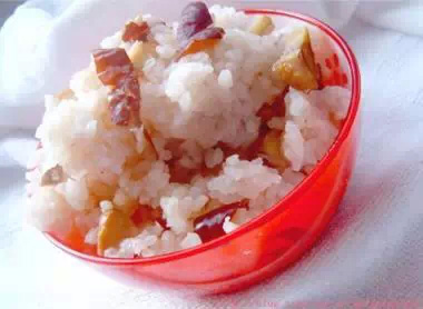 方法:將黨參和大棗用水同煎半小時(shí),去掉黨參渣;用糯米蒸飯,將大棗鋪于飯上,將棗參湯加白糖煎為濃汁淋在飯上即可食用。